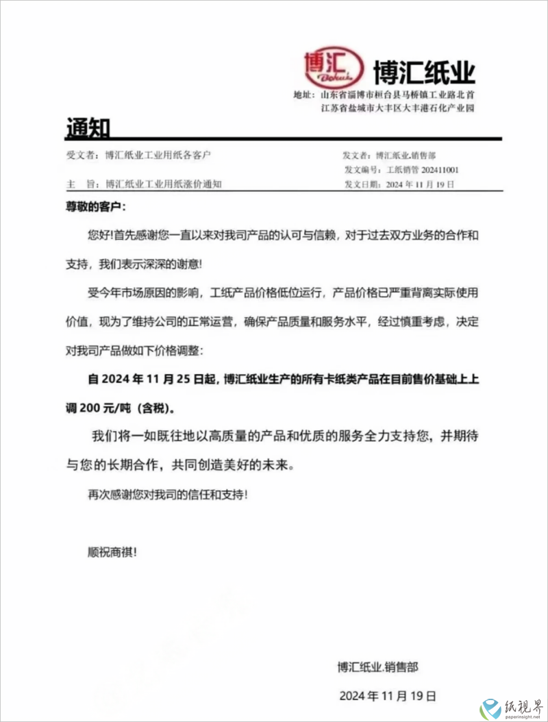博汇纸业:自11月25日起,博汇纸业生产的所有卡纸类产品在目前售价基础上上调200元/吨(含税)。