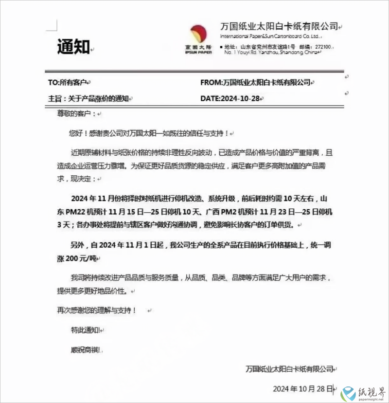 万国纸业太阳白卡纸有限公司:自11月26日起,全系列产品在目前执行价格基础上统一涨价200元/吨。