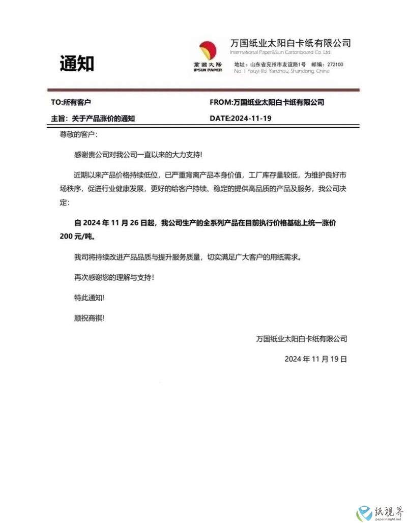 万国纸业太阳白卡纸有限公司:自11月26日起,全系列产品在目前执行价格基础上统一涨价200元/吨。